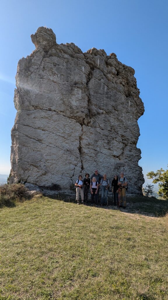 les marcheurs devant La Pangée, La Baume Cornillane. Après avoir marché dans les nuages toute la matinée, le soleil a réussi à les percer pour nous donner un après-midi magnifique.