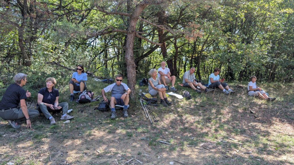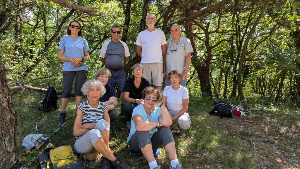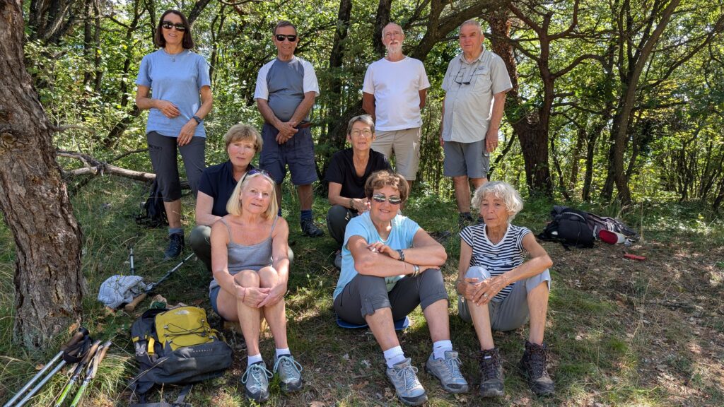 les marcheurs devant La Pangée, La Baume Cornillane. Après avoir marché dans les nuages toute la matinée, le soleil a réussi à les percer pour nous donner un après-midi magnifique.